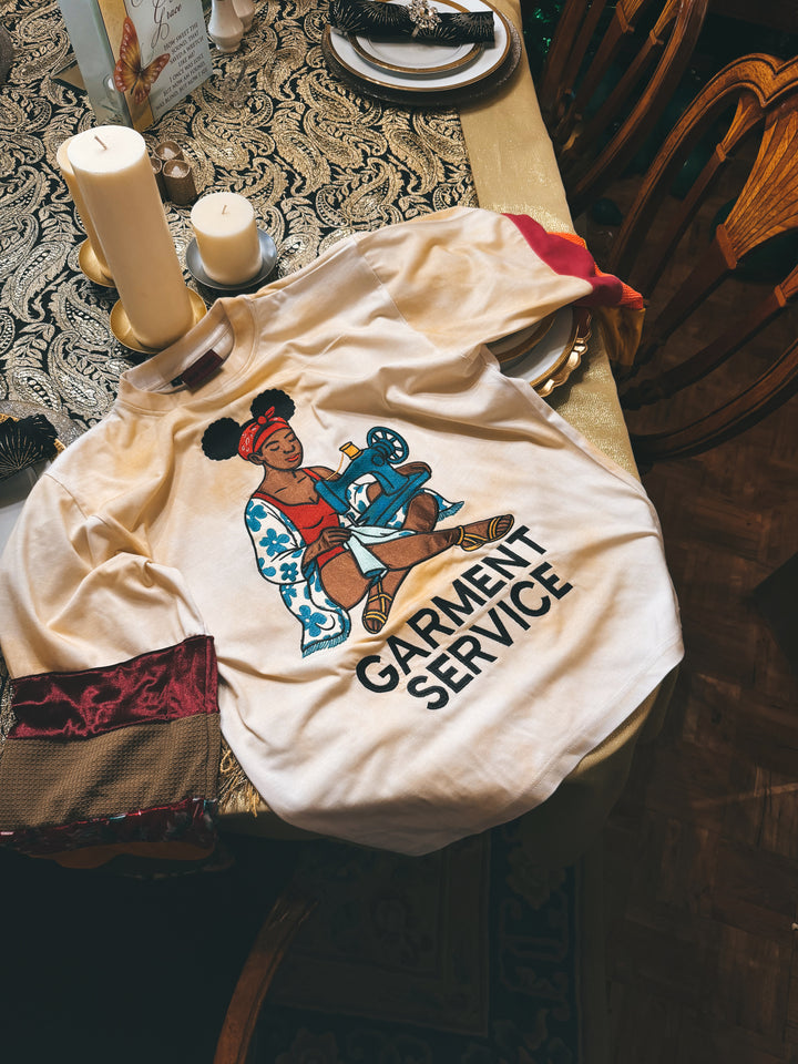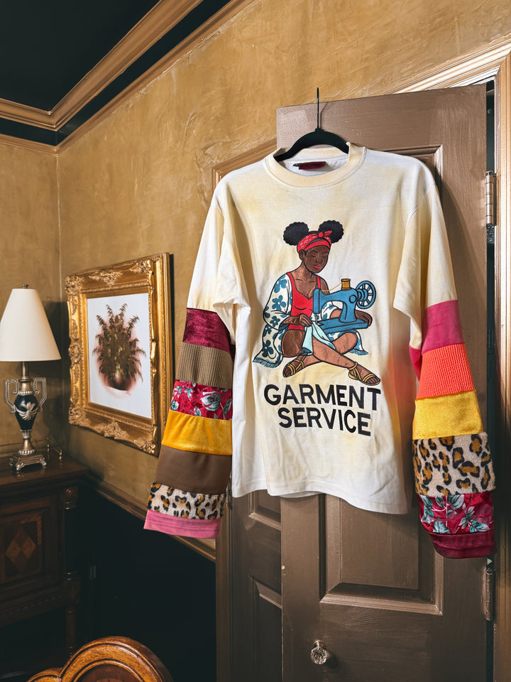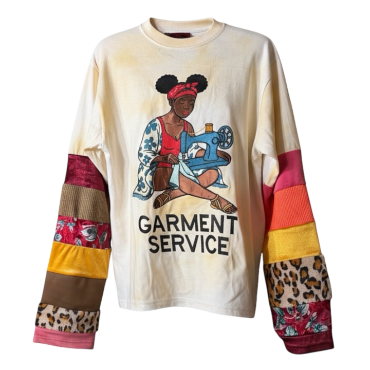 Details: Cut & Sew, 10 hand sewn sleeve panels from previous patch work denim drops, Garment Service graphic, mud wash dyed for earthy worn look