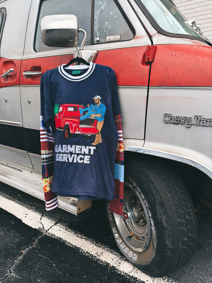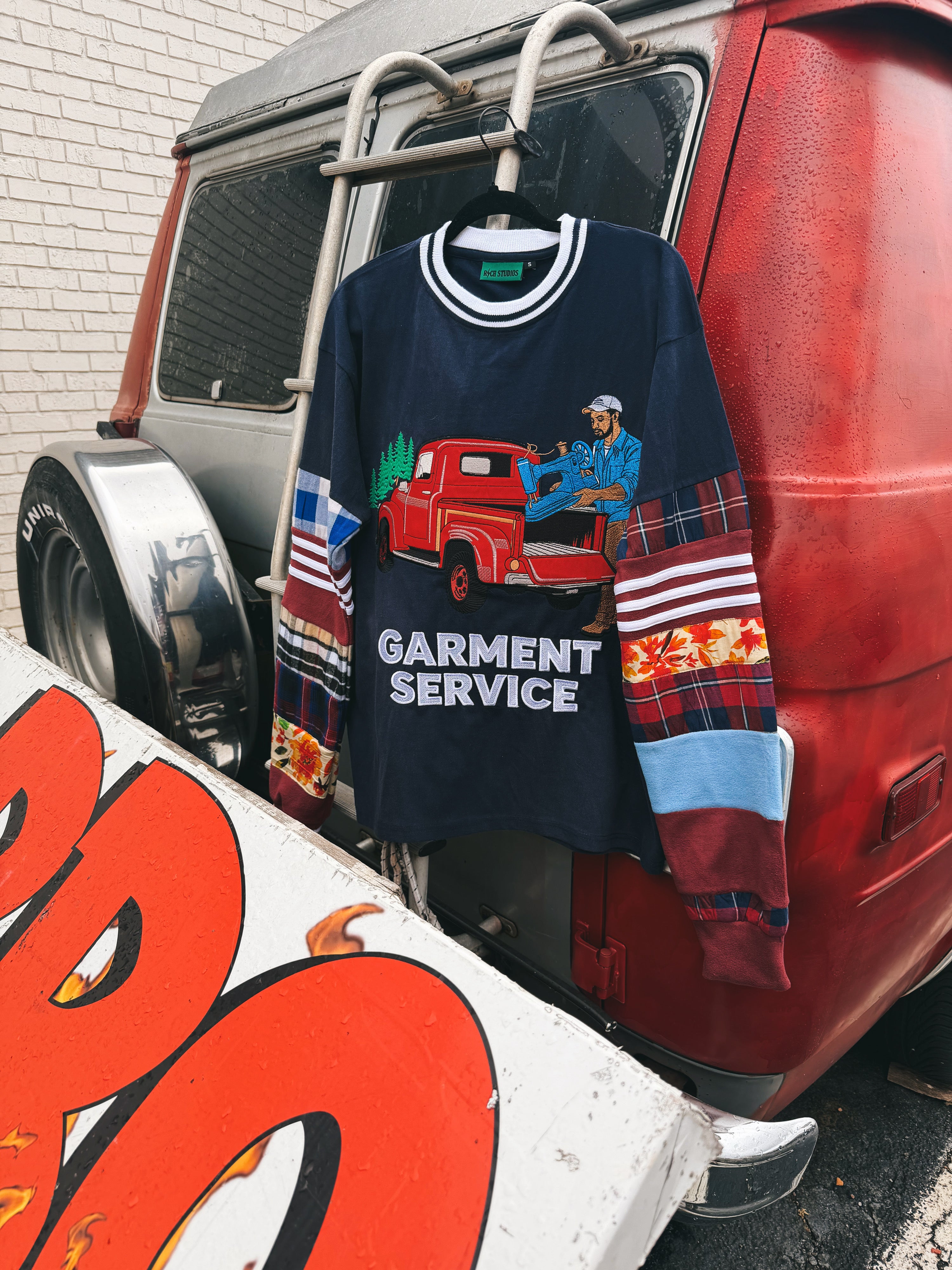 Details: Cut & Sew, 10 hand sewn sleeve panels from previous patch work denim drops, Garment Service graphic